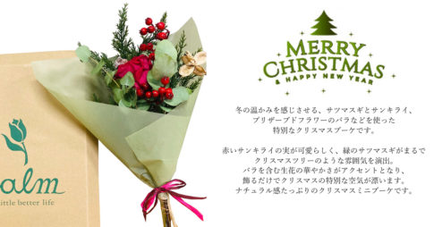 お花購入ページへジャンプ 冬の温かみを感じさせる、サツマスギとサンキライ、プリザーブドフラワーのバラなどを使った特別なクリスマスブーケです。赤いサンキライの実が可愛らしく、緑のサツマスギがまるでクリスマスツリーのような雰囲気...
