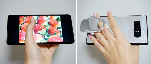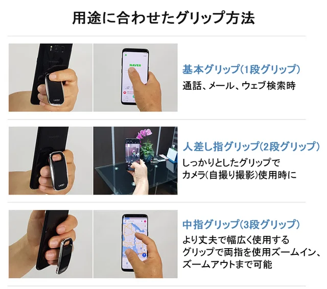 安定感があるので指でちょとやそっとの動作でスマートフォンが落ちることはありません。 スマホを持つと同時に親指と人差し指が使えるので片手で簡単にズームイン、ズームアウトまでできます。